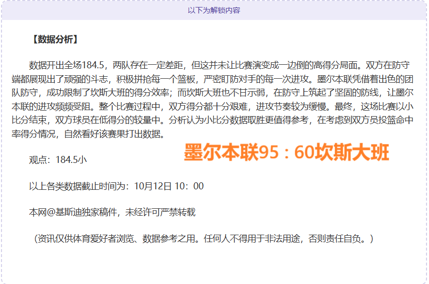 【成绩回顾】近17胜11,昨日NBL(A)二全胜、西篮甲获得胜利,精选比赛拆解本期再创连胜新高度,篮球方向连胜呈现非同凡响,拆解精准比赛继续收获连胜,篮球板块拆解数据勇往直前,资深篮球爱好者,用独立方式拆解赛事再为大家奉上。以下再为大家分享一场精彩赛事,敬请期待!